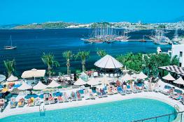 расположен в 35 км от аэропорта, в центре г. Бодрума, на самом берегу моря.