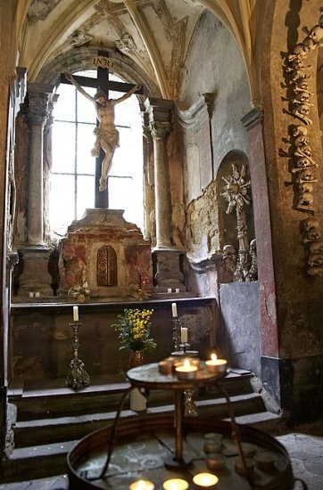 Далее были войны гуситов, народные волнения, и прочий демографический кризис и все это легло тяжким бременем на одно кладбище. В какой-то момент постоянно растущее кладбище всех достало и руководство распорядилось при новых захоронениях выгребать из земли старые кости и складывать в церковь. Таким образом, в церкви скопилось 6 огромных пирамид костей.