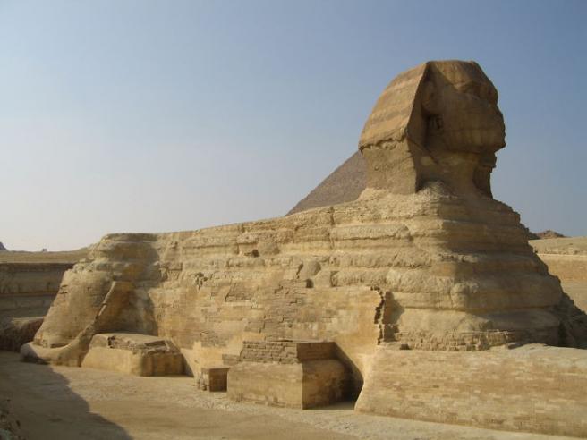 У каждой из великих пирамид существовал еще триединый комплекс: нижний погребальный храм - дорога - верхний погребальный храм. Но сохранился этот комплекс в более или менее целостном виде только у пирамиды Хефрена. Мощеная камнем дорога от нижнего храма, где проводилось бальзамирование, к верхнему, где перед погребением прощались с фараоном, протянулась более чем на полкилометра. Возле нижнего гранитного храма, лишенного кровли, лежат развалины храма Сфинкса. А за ними устремил свой взгляд на восток и сам древний хранитель пирамид - Большой Сфинкс. Сфинкс, отдыхающий лев с головой человека (мамлюкские солдаты отстрелили ему нос), представляет собой самую большую монолитную скульптуру. Его длина - 73 метра, высота - 20 метров. Считается, что сфинкс был вырублен во время строительства пирамиды Хефрена, а его лицо носит черты этого фараона.